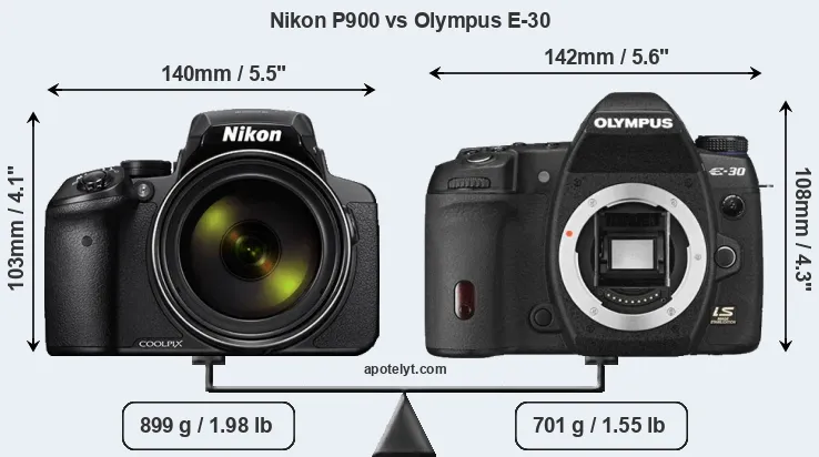 An illustration of the physical size and weight of the Nikon P900 and the Olympus E-30 is provided in the side-by-side display below. The two cameras are presented according to their relative size. Three consecutive views from the front, the top, and the rear side are shown. All width, height and depth dimensions are rounded to the nearest millimeter.