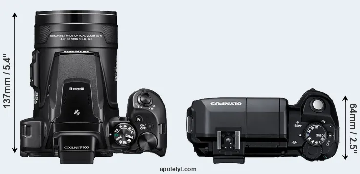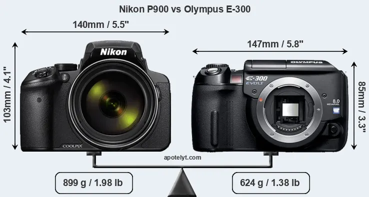The side-by-side display below illustrates the physical size and weight of the Nikon P900 and the Olympus E-300. The two cameras are presented according to their relative size. Three successive views from the front, the top, and the rear are shown. All size dimensions are rounded to the nearest millimeter.