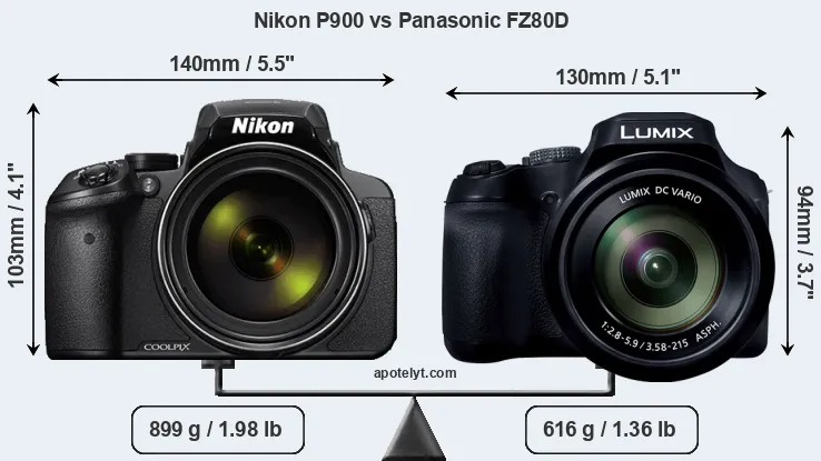 If the front view area (width x height) of the cameras is taken as an aggregate measure of their size, the Panasonic FZ80D is notably smaller (15 percent) than the Nikon P900. Moreover, the FZ80D is markedly lighter (31 percent) than the P900. In this context, it is worth noting that neither the P900 nor the FZ80D are weather-sealed.