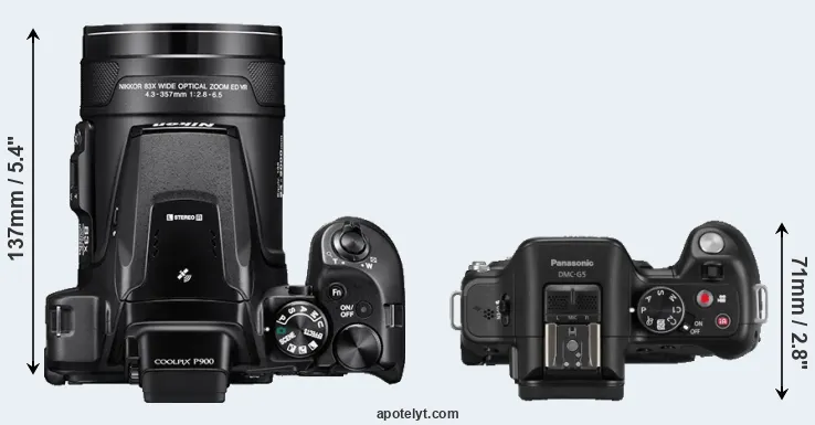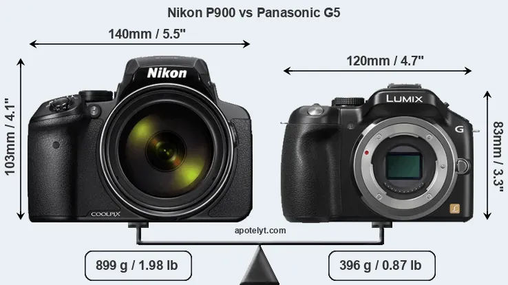 The side-by-side display below illustrates the physical size and weight of the Nikon P900 and the Panasonic G5. The two cameras are presented according to their relative size. Three consecutive views from the front, the top, and the rear side are shown. All width, height and depth dimensions are rounded to the nearest millimeter.