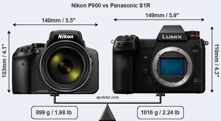 If the front view area (width x height) of the cameras is taken as an aggregate measure of their size, the Panasonic S1R is notably larger (14 percent) than the Nikon P900. It is noteworthy in this context that the S1R is splash and dust-proof, while the P900 does not feature any corresponding weather-sealing.