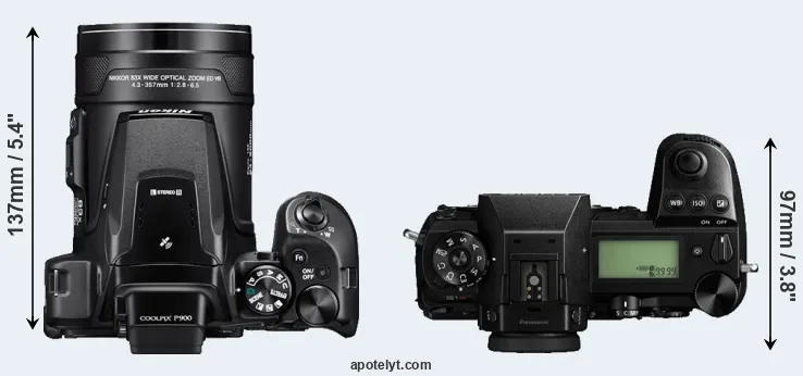 The side-by-side display below illustrates the physical size and weight of the Nikon P900 and the Panasonic S1R. The two cameras are presented according to their relative size. Three consecutive views from the front, the top, and the rear side are shown. All width, height and depth dimensions are rounded to the nearest millimeter.