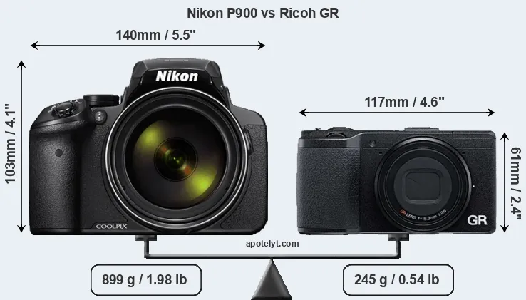 An illustration of the physical size and weight of the Nikon P900 and the Ricoh GR is provided in the side-by-side display below. The two cameras are presented according to their relative size. Three consecutive views from the front, the top, and the rear side are shown. All width, height and depth measures are rounded to the nearest millimeter.