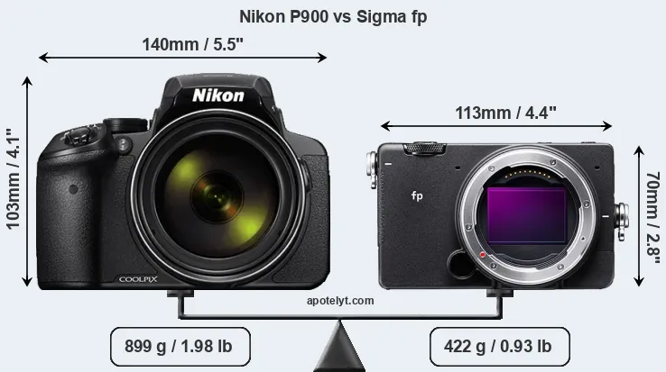 The physical size and weight of the Nikon P900 and the Sigma fp are illustrated in the side-by-side display below. The two cameras are presented according to their relative size. Three consecutive perspectives from the front, the top, and the back are available. All width, height and depth measures are rounded to the nearest millimeter.