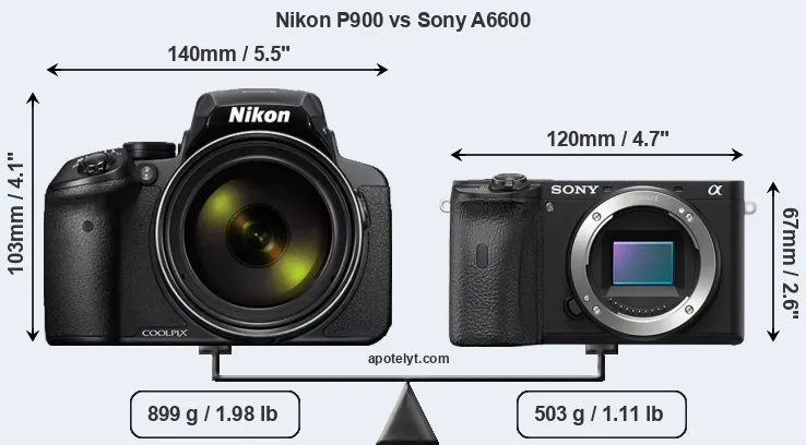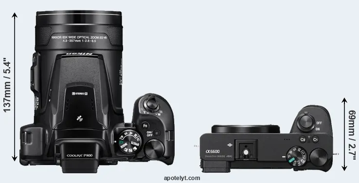 An illustration of the physical size and weight of the Nikon P900 and the Sony A6600 is provided in the side-by-side display below. The two cameras are presented according to their relative size. Three successive views from the front, the top, and the rear are shown. All width, height and depth dimensions are rounded to the nearest millimeter.