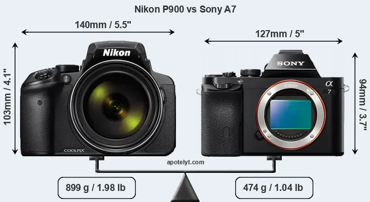The physical size and weight of the Nikon P900 and the Sony A7 are illustrated in the side-by-side display below. The two cameras are presented according to their relative size. Three consecutive views from the front, the top, and the rear side are shown. All width, height and depth measures are rounded to the nearest millimeter.