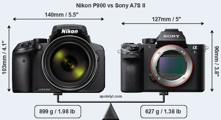 The physical size and weight of the Nikon P900 and the Sony A7S II are illustrated in the side-by-side display below. The two cameras are presented according to their relative size. Three consecutive perspectives from the front, the top, and the back are available. All width, height and depth dimensions are rounded to the nearest millimeter.