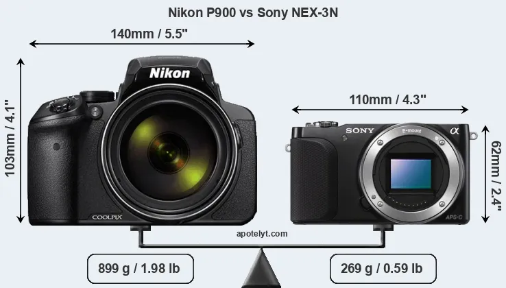 An illustration of the physical size and weight of the Nikon P900 and the Sony NEX-3N is provided in the side-by-side display below. The two cameras are presented according to their relative size. Three consecutive views from the front, the top, and the rear side are shown. All width, height and depth measures are rounded to the nearest millimeter.