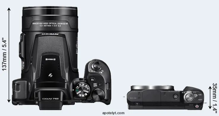 If the front view area (width x height) of the cameras is taken as an aggregate measure of their size, the Sony NEX-3N is considerably smaller (53 percent) than the Nikon P900. In this context, it is worth noting that neither the P900 nor the NEX-3N are weather-sealed.