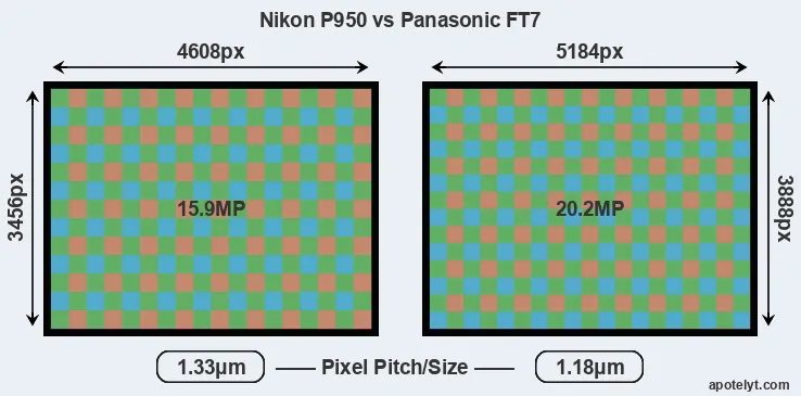 While the two cameras under review share the same sensor size, the FT7 offers a higher resolution of 20.2 megapixels, compared with 15.9 MP of the P950. This megapixels advantage translates into a 13 percent gain in linear resolution. On the other hand, these sensor specs imply that the FT7 has a higher pixel density and a smaller size of the individual pixel (with a pixel pitch of 1.18μm versus 1.33μm for the P950). Moreover, it should be noted, that the P950 is a somewhat more recent model (by 1 year and 7 months) than the FT7, and its sensor might have benefitted from technological advances during this time that further enhance the light gathering capacity of individual pixels. Coming back to sensor resolution, it should be mentioned that the P950 has no anti-alias filter installed, so that it can capture all the detail its sensor resolves.