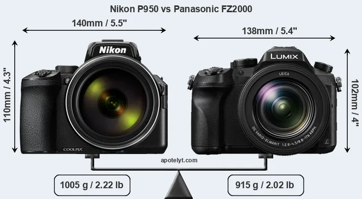 The physical size and weight of the Nikon P950 and the Panasonic FZ2000 are illustrated in the side-by-side display below. The two cameras are presented according to their relative size. Three successive views from the front, the top, and the rear are shown. All width, height and depth measures are rounded to the nearest millimeter.