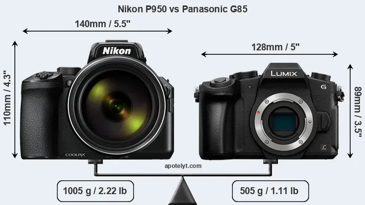 The side-by-side display below illustrates the physical size and weight of the Nikon P950 and the Panasonic G85. The two cameras are presented according to their relative size. Three consecutive perspectives from the front, the top, and the back are available. All width, height and depth measures are rounded to the nearest millimeter.
