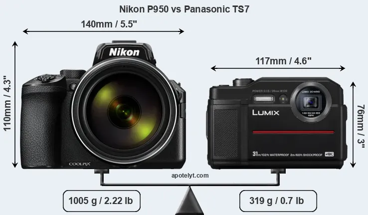 The physical size and weight of the Nikon P950 and the Panasonic TS7 are illustrated in the side-by-side display below. The two cameras are presented according to their relative size. Three successive views from the front, the top, and the rear are shown. All width, height and depth measures are rounded to the nearest millimeter.