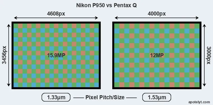 While the two cameras under review share the same sensor size, the P950 offers a higher resolution of 15.9 megapixels, compared with 12 MP of the Pentax Q. This megapixels advantage translates into a 15 percent gain in linear resolution. On the other hand, these sensor specs imply that the P950 has a higher pixel density and a smaller size of the individual pixel (with a pixel pitch of 1.33μm versus 1.53μm for the Pentax Q). In this context, it should be noted, however, that the P950 is much more recent (by 8 years and 6 months) than the Pentax Q, and its sensor will have benefitted from technological advances during this time that compensate for the smaller pixel size. Coming back to sensor resolution, it should be mentioned that the P950 has no anti-alias filter installed, so that it can capture all the detail its sensor resolves.