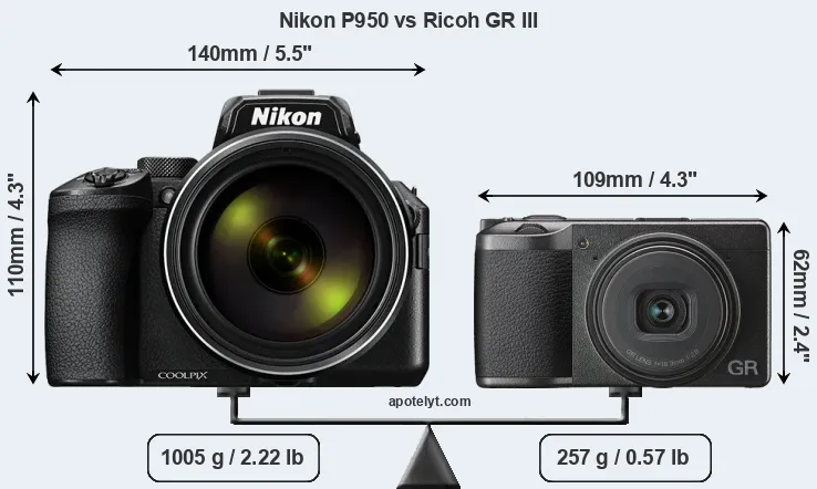 The side-by-side display below illustrates the physical size and weight of the Nikon P950 and the Ricoh GR III. The two cameras are presented according to their relative size. Three consecutive perspectives from the front, the top, and the back are available. All width, height and depth dimensions are rounded to the nearest millimeter.