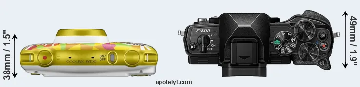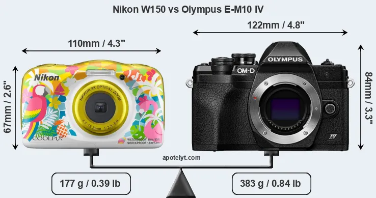 An illustration of the physical size and weight of the Nikon W150 and the Olympus E-M10 IV is provided in the side-by-side display below. The two cameras are presented according to their relative size. Three consecutive views from the front, the top, and the rear side are shown. All width, height and depth measures are rounded to the nearest millimeter.