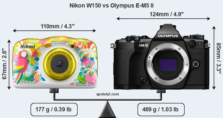 The physical size and weight of the Nikon W150 and the Olympus E-M5 II are illustrated in the side-by-side display below. The two cameras are presented according to their relative size. Three consecutive views from the front, the top, and the rear side are shown. All size dimensions are rounded to the nearest millimeter.