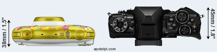 If the front view area (width x height) of the cameras is taken as an aggregate measure of their size, the Olympus E-M5 II is considerably larger (43 percent) than the Nikon W150. In this context, it is worth noting that both cameras are splash and dust-proof and can, hence, be used in inclement weather conditions or harsh environments. More than that, the W150 is water-proof up to 10m and can, thus, be used for underwater photography.