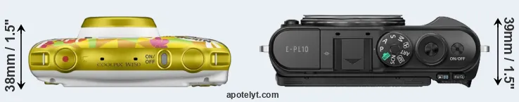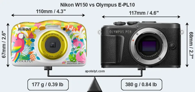 An illustration of the physical size and weight of the Nikon W150 and the Olympus E-PL10 is provided in the side-by-side display below. The two cameras are presented according to their relative size. Three successive views from the front, the top, and the rear are shown. All width, height and depth dimensions are rounded to the nearest millimeter.