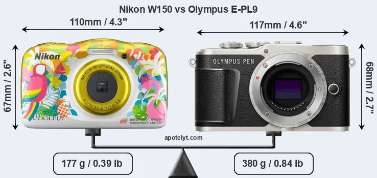 An illustration of the physical size and weight of the Nikon W150 and the Olympus E-PL9 is provided in the side-by-side display below. The two cameras are presented according to their relative size. Three successive views from the front, the top, and the rear are shown. All width, height and depth dimensions are rounded to the nearest millimeter.