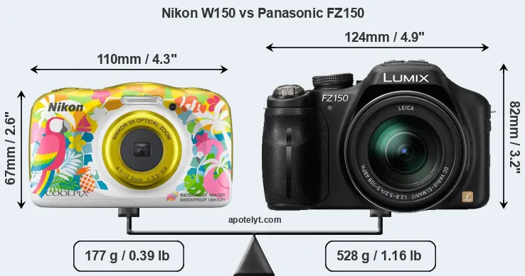 The physical size and weight of the Nikon W150 and the Panasonic FZ150 are illustrated in the side-by-side display below. The two cameras are presented according to their relative size. Three consecutive perspectives from the front, the top, and the back are available. All width, height and depth dimensions are rounded to the nearest millimeter.