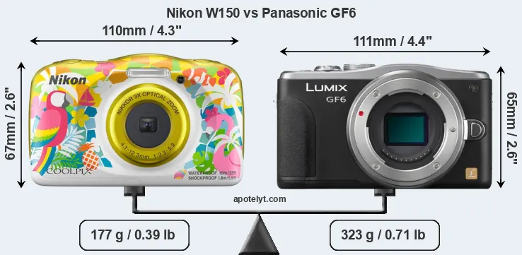 The physical size and weight of the Nikon W150 and the Panasonic GF6 are illustrated in the side-by-side display below. The two cameras are presented according to their relative size. Three consecutive views from the front, the top, and the rear side are shown. All width, height and depth measures are rounded to the nearest millimeter.
