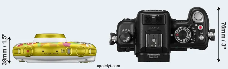 An illustration of the physical size and weight of the Nikon W150 and the Panasonic GH2 is provided in the side-by-side display below. The two cameras are presented according to their relative size. Three successive views from the front, the top, and the rear are shown. All size dimensions are rounded to the nearest millimeter.