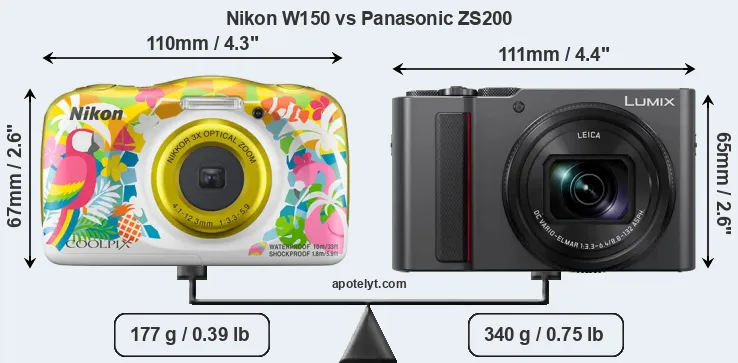 The side-by-side display below illustrates the physical size and weight of the Nikon W150 and the Panasonic ZS200. The two cameras are presented according to their relative size. Three consecutive perspectives from the front, the top, and the back are available. All width, height and depth measures are rounded to the nearest millimeter.