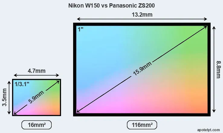 Of the two cameras under consideration, the Nikon W150 features a 1/3.1-inch sensor and the Panasonic ZS200 an one-inch sensor. The sensor area in the ZS200 is 625 percent bigger. As a result of these sensor size differences, the cameras have a format factor of, respectively, 7.4 and 2.7. The sensor in the W150 has a native 4:3 aspect ratio, while the one in the ZS200 offers a 3:2 aspect.