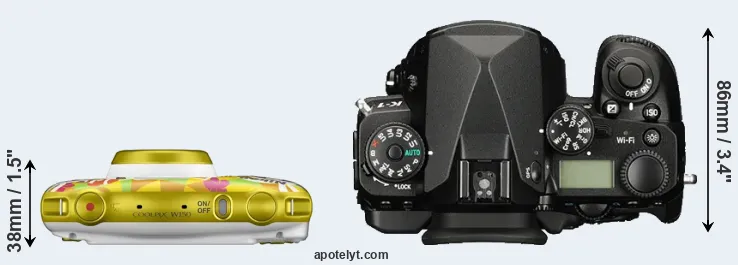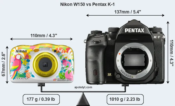 An illustration of the physical size and weight of the Nikon W150 and the Pentax K-1 is provided in the side-by-side display below. The two cameras are presented according to their relative size. Three consecutive views from the front, the top, and the rear side are shown. All width, height and depth measures are rounded to the nearest millimeter.