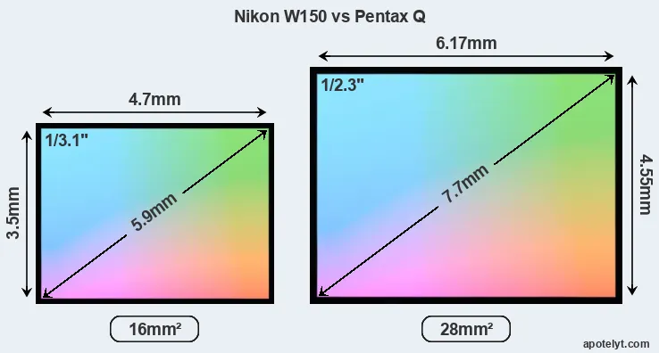 Of the two cameras under consideration, the Nikon W150 features a 1/3.1-inch sensor and the Pentax Q a 1/2.3-inch sensor. The sensor area in the Pentax Q is 75 percent bigger. As a result of these sensor size differences, the cameras have a format factor of, respectively, 7.4 and 5.6. Both cameras feature a native aspect ratio (sensor width to sensor height) of 4:3.