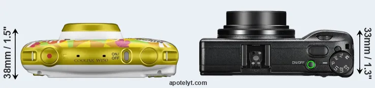 An illustration of the physical size and weight of the Nikon W150 and the Ricoh GR III is provided in the side-by-side display below. The two cameras are presented according to their relative size. Three consecutive views from the front, the top, and the rear side are shown. All size dimensions are rounded to the nearest millimeter.