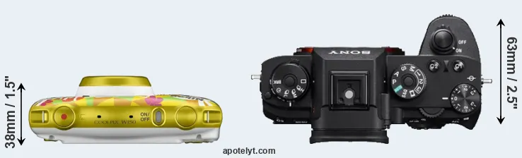 The physical size and weight of the Nikon W150 and the Sony A9 are illustrated in the side-by-side display below. The two cameras are presented according to their relative size. Three consecutive perspectives from the front, the top, and the back are available. All size dimensions are rounded to the nearest millimeter.