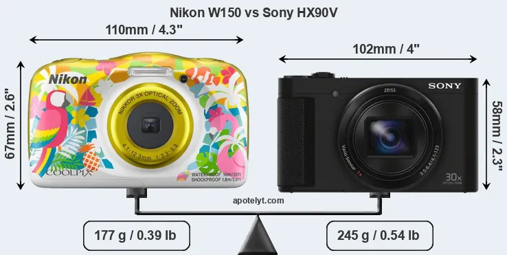 An illustration of the physical size and weight of the Nikon W150 and the Sony HX90V is provided in the side-by-side display below. The two cameras are presented according to their relative size. Three successive views from the front, the top, and the rear are shown. All width, height and depth measures are rounded to the nearest millimeter.