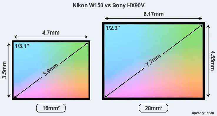Of the two cameras under consideration, the Nikon W150 features a 1/3.1-inch sensor and the Sony HX90V a 1/2.3-inch sensor. The sensor area in the HX90V is 75 percent bigger. As a result of these sensor size differences, the cameras have a format factor of, respectively, 7.4 and 5.6. Both cameras feature a native aspect ratio (sensor width to sensor height) of 4:3.