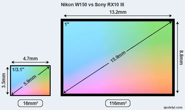 Of the two cameras under consideration, the Nikon W150 features a 1/3.1-inch sensor and the Sony RX10 III an one-inch sensor. The sensor area in the RX10 III is 625 percent bigger. As a result of these sensor size differences, the cameras have a format factor of, respectively, 7.4 and 2.7. The sensor in the W150 has a native 4:3 aspect ratio, while the one in the RX10 III offers a 3:2 aspect.