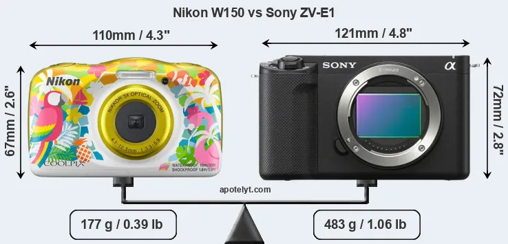 The physical size and weight of the Nikon W150 and the Sony ZV-E1 are illustrated in the side-by-side display below. The two cameras are presented according to their relative size. Three consecutive views from the front, the top, and the rear side are shown. All width, height and depth dimensions are rounded to the nearest millimeter.
