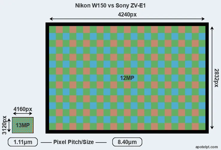 Despite having a smaller sensor, the Nikon W150 offers a higher resolution of 13 megapixels, compared with 12 MP of the Sony ZV-E1. This megapixels advantage comes at the cost of a higher pixel density and a smaller size of the individual pixel (with a pixel pitch of 1.11μm versus 8.40μm for the ZV-E1). Moreover, it should be noted that the ZV-E1 is much more recent (by 3 years and 11 months) than the W150, and its sensor will have benefitted from technological advances during this time that further enhance the light gathering capacity of its pixel-units. Coming back to sensor resolution, it should be mentioned that the W150 has no anti-alias filter installed, so that it can capture all the detail its sensor resolves.