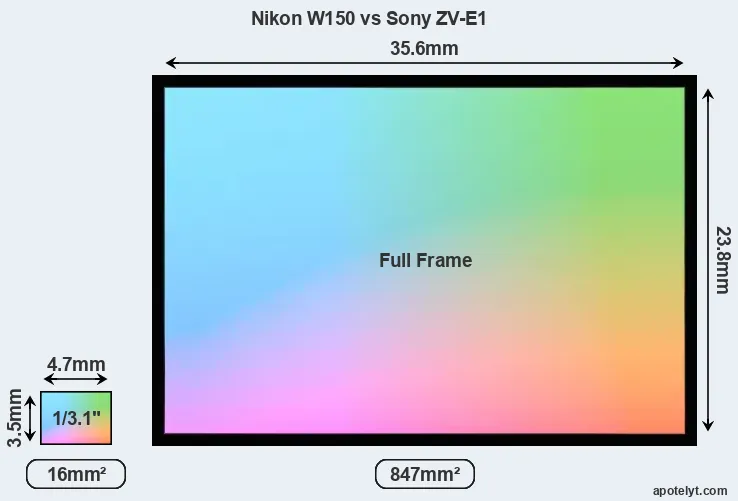 Of the two cameras under consideration, the Nikon W150 features a 1/3.1-inch sensor and the Sony ZV-E1 a full frame sensor. The sensor area in the ZV-E1 is 5194 percent bigger. As a result of these sensor size differences, the cameras have a format factor of, respectively, 7.4 and 1.0. The sensor in the W150 has a native 4:3 aspect ratio, while the one in the ZV-E1 offers a 3:2 aspect.