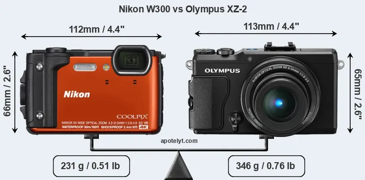 An illustration of the physical size and weight of the Nikon W300 and the Olympus XZ-2 is provided in the side-by-side display below. The two cameras are presented according to their relative size. Three consecutive views from the front, the top, and the rear side are shown. All width, height and depth measures are rounded to the nearest millimeter.