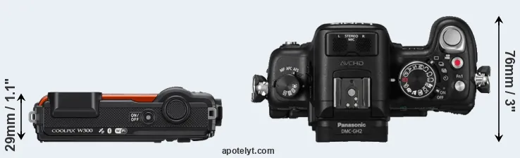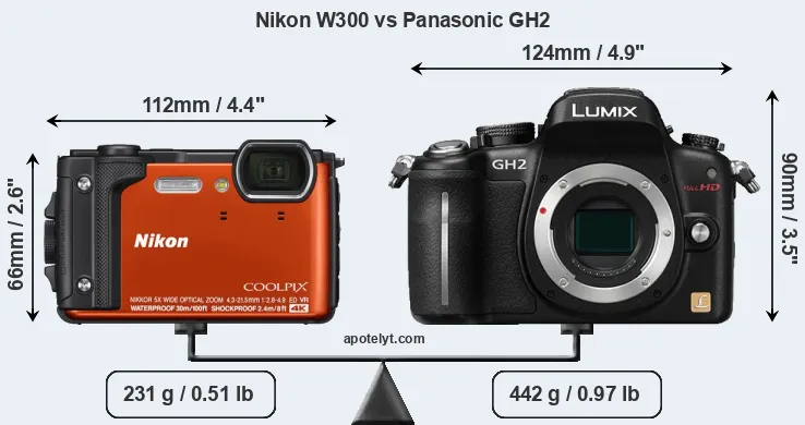 An illustration of the physical size and weight of the Nikon W300 and the Panasonic GH2 is provided in the side-by-side display below. The two cameras are presented according to their relative size. Three consecutive views from the front, the top, and the rear side are shown. All size dimensions are rounded to the nearest millimeter.