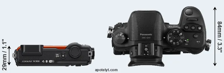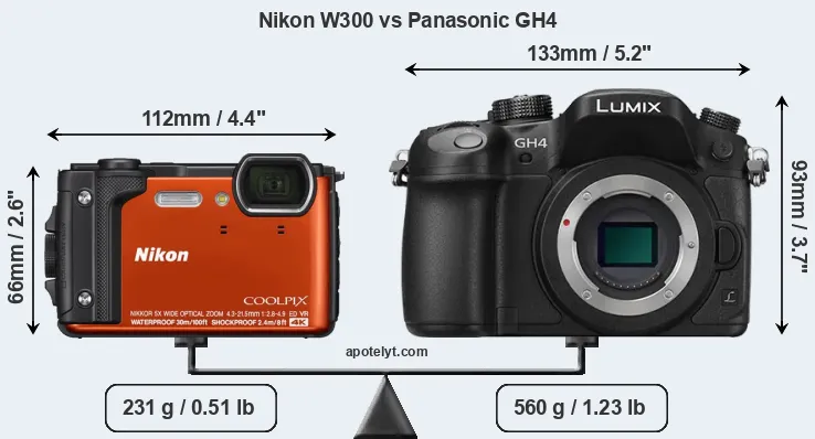 The physical size and weight of the Nikon W300 and the Panasonic GH4 are illustrated in the side-by-side display below. The two cameras are presented according to their relative size. Three consecutive views from the front, the top, and the rear side are shown. All width, height and depth dimensions are rounded to the nearest millimeter.