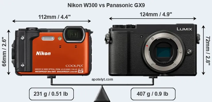 An illustration of the physical size and weight of the Nikon W300 and the Panasonic GX9 is provided in the side-by-side display below. The two cameras are presented according to their relative size. Three consecutive views from the front, the top, and the rear side are shown. All width, height and depth measures are rounded to the nearest millimeter.