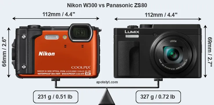 The side-by-side display below illustrates the physical size and weight of the Nikon W300 and the Panasonic ZS80. The two cameras are presented according to their relative size. Three consecutive perspectives from the front, the top, and the back are available. All width, height and depth dimensions are rounded to the nearest millimeter.