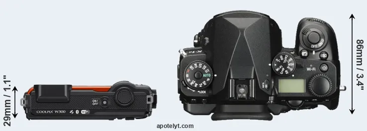 The side-by-side display below illustrates the physical size and weight of the Nikon W300 and the Pentax K-1 II. The two cameras are presented according to their relative size. Three consecutive views from the front, the top, and the rear side are shown. All width, height and depth dimensions are rounded to the nearest millimeter.
