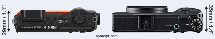 The side-by-side display below illustrates the physical size and weight of the Nikon W300 and the Ricoh GR. The two cameras are presented according to their relative size. Three consecutive perspectives from the front, the top, and the back are available. All width, height and depth measures are rounded to the nearest millimeter.