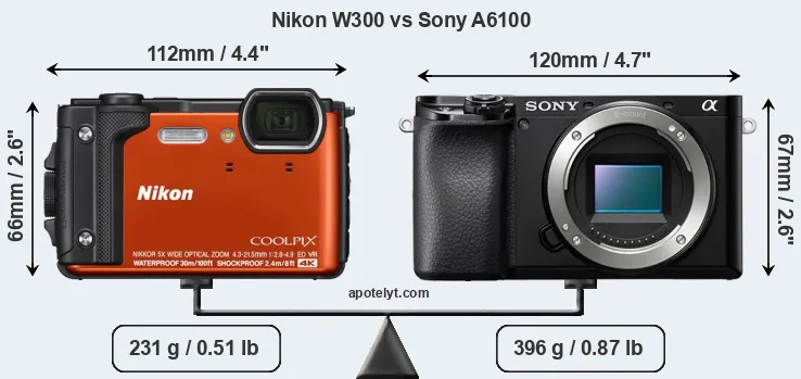 An illustration of the physical size and weight of the Nikon W300 and the Sony A6100 is provided in the side-by-side display below. The two cameras are presented according to their relative size. Three consecutive views from the front, the top, and the rear side are shown. All width, height and depth dimensions are rounded to the nearest millimeter.