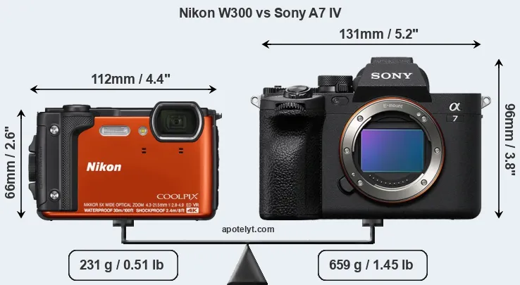 An illustration of the physical size and weight of the Nikon W300 and the Sony A7 IV is provided in the side-by-side display below. The two cameras are presented according to their relative size. Three consecutive perspectives from the front, the top, and the back are available. All width, height and depth dimensions are rounded to the nearest millimeter.