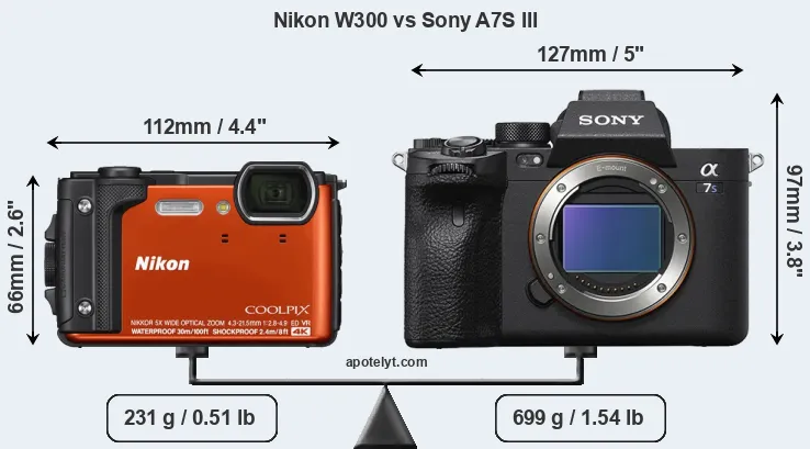The Nikon Coolpix W300 and the Sony Alpha 7S III are two digital cameras that were revealed to the public, respectively, in May 2017 and July 2020. The W300 is a fixed lens compact, while the A7S III is a mirrorless interchangeable lens camera. The cameras are based on a 1/2.3-inch (W300) and a full frame (A7S III) sensor. The Nikon has a resolution of 15.9 megapixels, whereas the Sony provides 12 MP.