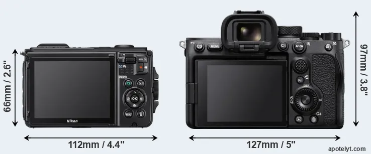 If the front view area (width x height) of the cameras is taken as an aggregate measure of their size, the Sony A7S III is considerably larger (67 percent) than the Nikon W300. In this context, it is worth noting that both cameras are splash and dust-proof and can, hence, be used in inclement weather conditions or harsh environments. More than that, the W300 is water-proof up to 30m and can, thus, be used for underwater photography.